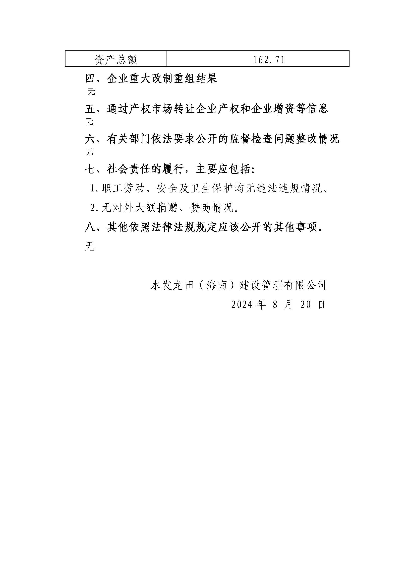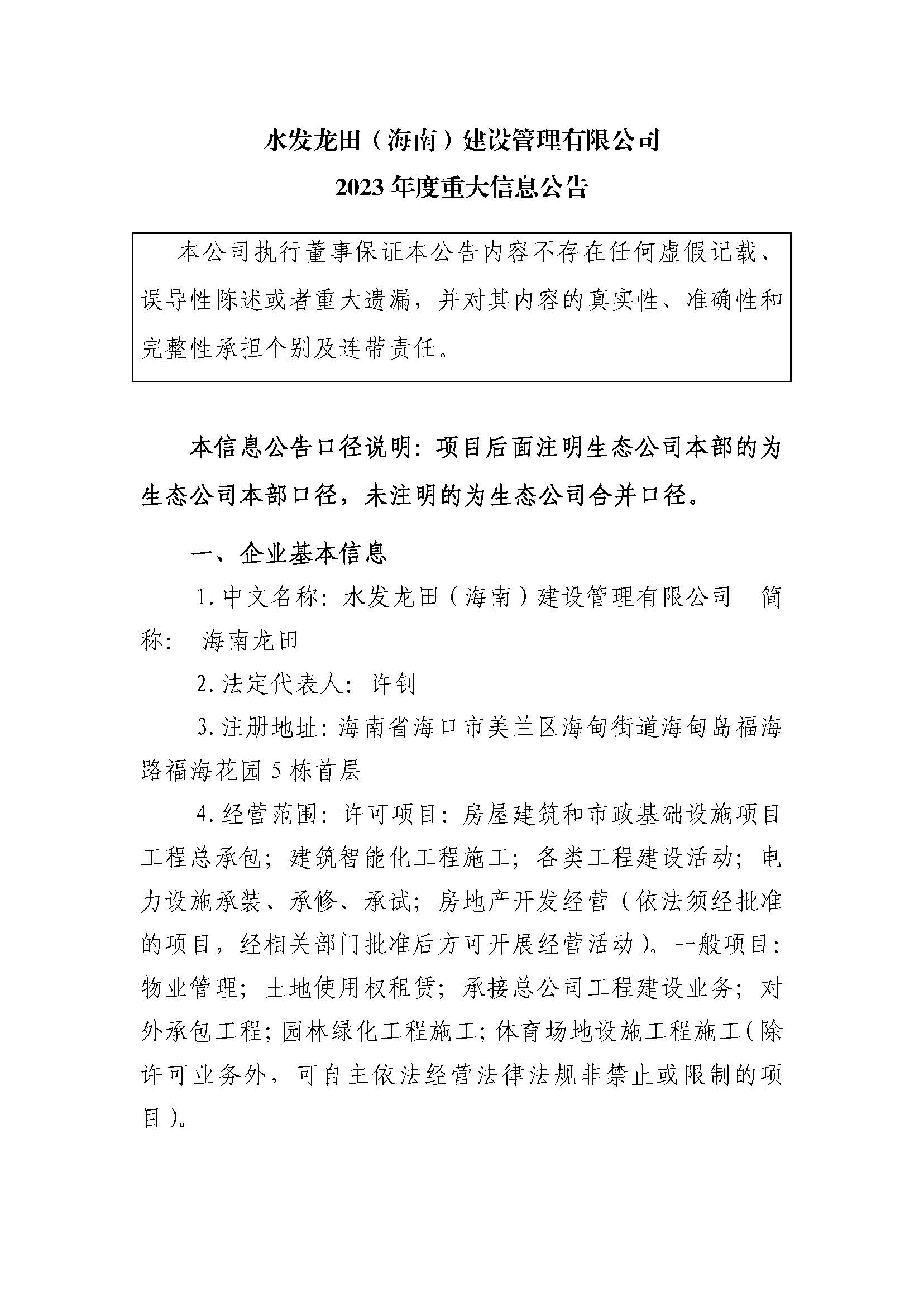 水发龙田(海南)建设管理有限公司 2023年度重大信息公告