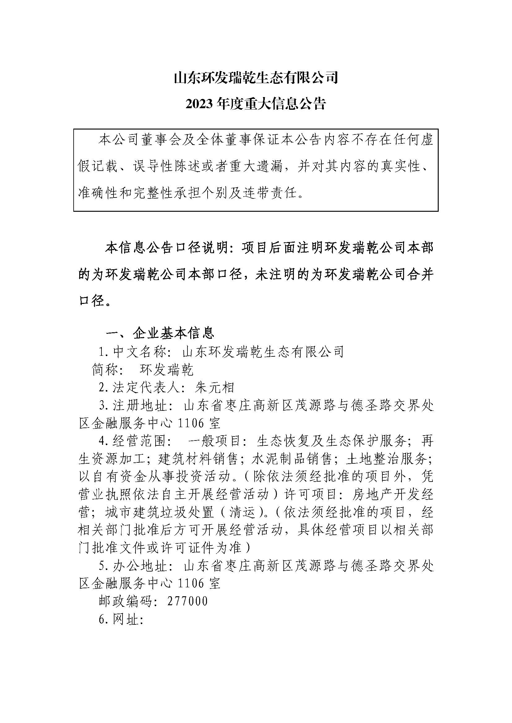 山东环发瑞乾生态有限公司2023年度重大信息公告
